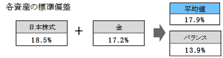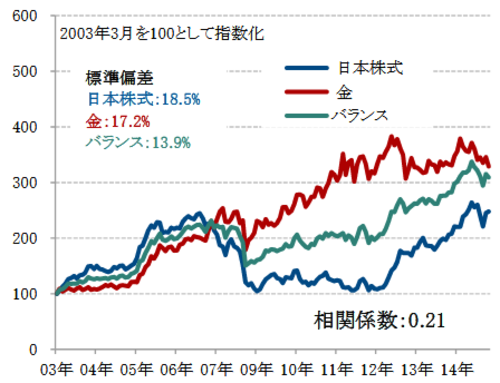 違う方向に動く日本株式と金を50%ずつ組み合わせたバランス(相関係数0.21)