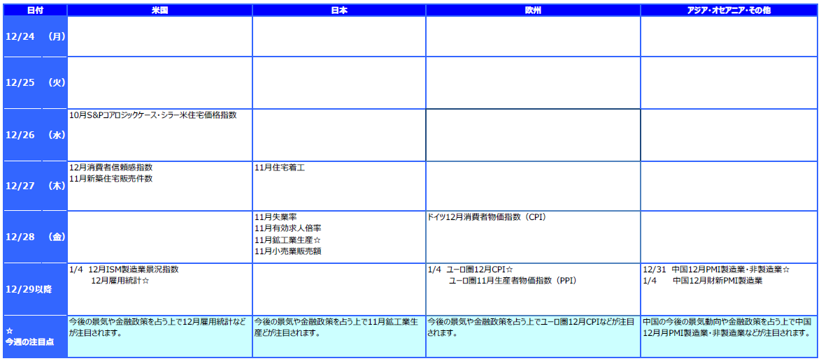 三井住友アセットマネジメント株式会社が、2018年12月17日~12月21日のマーケットについて振り返り、「1. 先週の市場動向、2. 先週のマーケット・デイリー/ウィークリー、3. 今週の主な注目材料」のそれぞれについて解説します。今回は、「3. 今週の主な注目材料」を見ていきましょう。※本連載は、三井住友アセットマネジメント株式会社が提供するマーケットレポートを転載したものです。