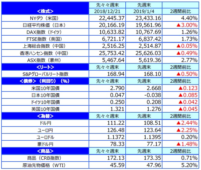 主要国の株式市場はまちまちとなりました。米国株式市場は、中国景気の減速懸念や大手IT企業の業績下方修正の発表を受けて大幅に下落する局面もありました。ただ4日には強い米12月雇用統計や、パウエル米連邦準備制度理事会(FRB)議長が、必要があれば金融政策を変更すると発言したことなどから、市場の懸念が和らぎ、NYダウは700ドルを超える大幅上昇となりました。12月21日から1月4日では4.40%上昇しました。日本株式市場は、中国景気の減速懸念や米大手IT企業の業績下方修正の発表を受けた米国株安や円高などを嫌気して同期間に日経平均株価は3.00%下落しました。欧州株式市場では、米中貿易交渉の進展期待などからドイツDAX指数は1.26%、英国FTSE指数は1.73%上昇しました。中国本土株市場は、香港ハンセン指数は0.49%下落、上海総合指数はほぼ横ばいとなりました。