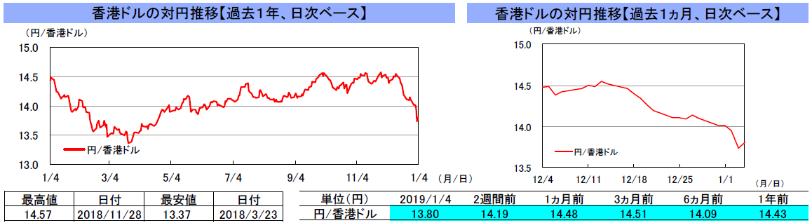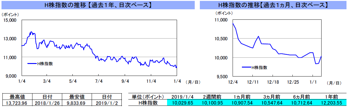 昨年12/24~1/4の中国本土市場は、上海総合指数が▲0.05%、深セン総合指数が▲0.40%とわずかに下落しました。発表された中国の11月の工業利益や、中国政府や民間機関による12月の製造業購買担当者景気指数(PMI)の悪化などが嫌気されました。一方、1/4には米中通商問題に関して次官級協議が1/7~8に行われると報道されたことから株価が大幅に上昇し、それまでの下落を埋めました。昨年12/24~1/4の香港市場は、H株指数が▲0.71%、レッドチップ指数が▲0.42%と下落しました。米国や中国などの景況感指数の悪化や、米国大手ハイテク企業の売上見通しの下方修正などを受けた世界的な株価下落などが嫌気されました。ただし、米中通商問題の次官級協議開催の報道により、1/4には値を戻しました。