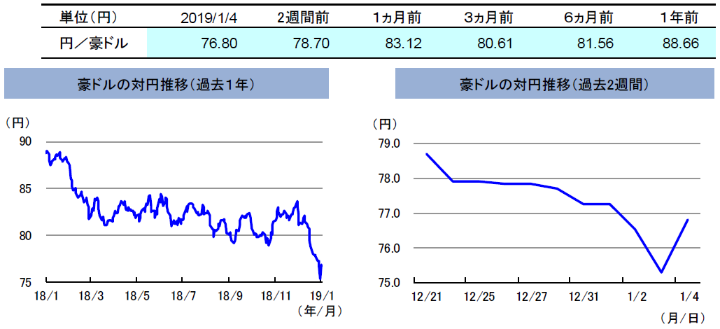 昨年12/24~1/4の豪ドルの対円レートは、下落しました。中国で発表された11月の工業利益や12月の製造業購買担当者景気指数(PMI)の悪化や、米国のISM製造業景況感指数の悪化、米大手ハイテク企業の売上見通しの下方修正などからリスク回避姿勢が強まり、円高が進みました。このため、豪ドルの対ドルレートは概ね横ばいでしたが、対円レートは下落しました。ただし1/4には、米中通商問題に関して次官級協議の開催予定が報じられた他、パウエル米連邦制度理事会(FRB)議長のハト派的コメントを受けて、リスク回避姿勢がやや和らぎました。