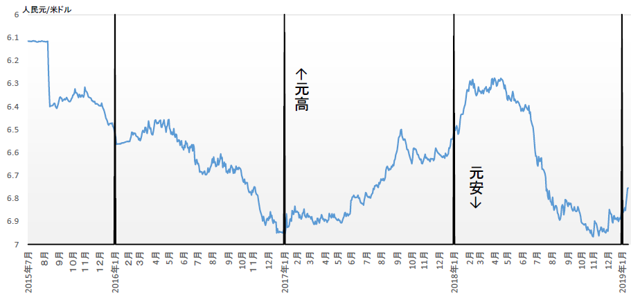 そもそも18年4月以降の人民元下落は中国当局が追加関税の影響を相殺するために誘導しているというより、17年来、資本流出規制強化など政策的後押しで上昇に転じていた相場が金利差など市場要因で下落に転じ、貿易戦争激化で加速したものだ。現状、中国は追加関税の影響を和らげる要因として人民元下落をある程度容認しつつも、急落は望まず、必要に応じ安定化を図るというスタンスだろう(参考:『再び上昇基調の人民元 中長期的な相場をどう見るか?』、2018年3月20日)。