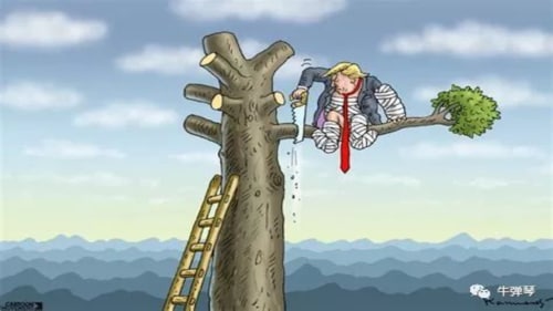 特朗普好比锯光了所有树干,他还开始锯自己坐着的那支,已经被打得绷带缠满身子的他,锯光后又会怎样?我们真不敢想象。哦,可怜的特朗普!