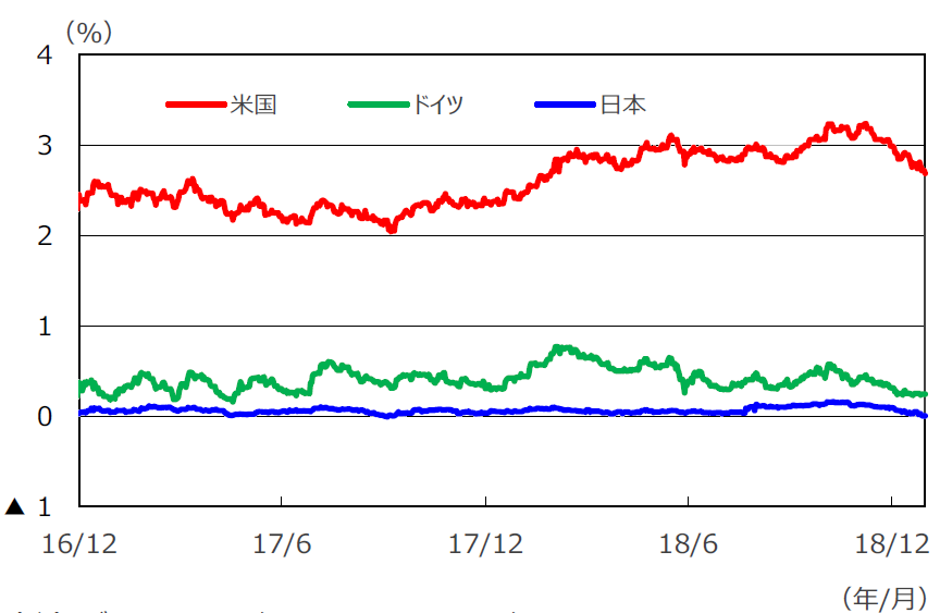 米10年国債利回りは、11月8日の3.24%を当面のピークとして低下基調に転じ、12月末は2.68%と2.7%を割込んで引けました。トランプ政権の通商政策が保護主義的な傾向を強めたこと等から、世界経済の先行きに対して不透明感が高まったこと、それにもかかわらず12月18日、19日に開催されたFOMCで、世界経済、物価動向を引き続き注視しつつも、「漸進的な利上げ路線は堅持」との方針が明示されたこと、世界的な株価や原油価格の下落に歯止めがかからなかったこと等によるものです。欧州でも、域内政治・経済動向の先行きへの警戒感が払拭されないなか、株価、原油価格の下落等を受けて、安全資産に対する需要が一段と強まり、ドイツ10年国債利回りは0.2%台前半まで低下しました。日本の10年国債利回りも、米長期金利の低下や欧米株式市場の下落等により、日銀の国債購入オペ減額にもかかわらず、低下しました。米国の社債については、「質への逃避」の動きの強まり等から、国債との利回り格差が前月末に比べ拡大しました。