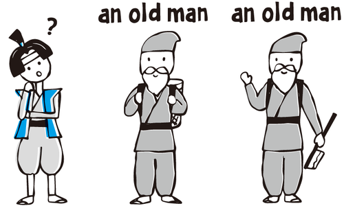 皆さんご存じの、日本の昔話『桃太郎』の冒頭部分です。初めておじいさんが紹介されるときにはanが使われていますが、次からはtheになっています。ここで再びAn old man went into・・・と言ってしまうと、おじいさんが何人も出てくるお話になってしまうというわけです。