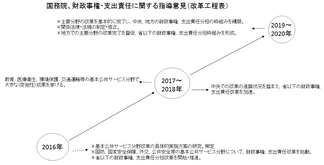 国務院は2016年8月、中央と地方の財政事権(財政面での所掌範囲・権限)と支出責任に関する指導意見を発出し、その中で、基本的な公共サービスは中央や省の上位政府、市や県などの下位政府が情報・管理面で優位にある公共サービスは下位政府の財政事権とし、これを基に各レベル政府の財政力を勘案して支出責任の分担を決める方針を発表した。この指導意見の中で示された改革工程表では17〜18年に基本公共サービス分野で大きな成果を挙げて改革を加速させ、19〜20年に作業を完了させるというタイムスケジュールが示されている(図表2)。