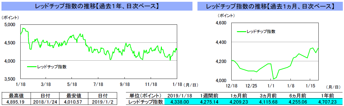 先週の中国本土市場は、上海総合指数が前週末比+1.7%、深セン総合指数が+0.7%と上昇しました。14日に発表された中国の12月の貿易統計では、輸出入ともに大幅に鈍化したことから、週初は株価が下落しました。しかしその後は、中国政府から相次いで景気対策などが発表されたことや、中国人民銀行が公開市場操作により連日で大規模な資金供給を行ったこと、一部で米政府が対中関税の引き下げを議論していると報じられたことを受けた米中貿易摩擦の緩和期待などから、株価は上昇しました。香港市場は、H株指数が前週末比+1.7%、レッドチップ指数が+1.5%と上昇しました。週初は、中国の12月の貿易統計の悪化を受けて株価が下落したものの、その後は中国政府の景気対策や米中貿易摩擦の緩和期待などから、株価は上昇しました。