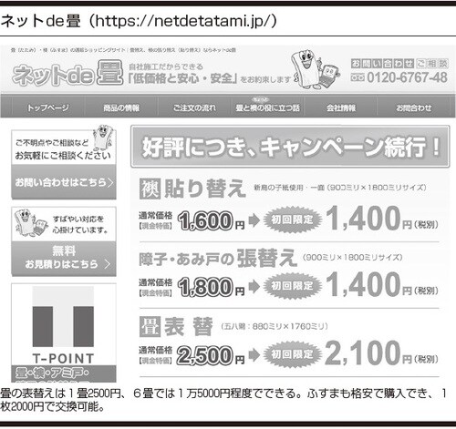 ちなみに、畳の表替えを行なう場合、前述の「ネットde畳」を利用すると、1畳2500円、6畳では1万5000円程度でできます。
