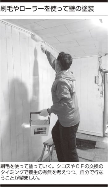 塗装の作業工程についてですが、クロスやCFを交換する予定なら、最初に行なうと、汚さないための養生が少なくてすみます。養生とは建築・引越しなどの作業で、先に完成した部分など作業の対象物の周辺物を汚損や傷から護るための処置です。この場合はまわりに塗料が飛び散らないよう、塗装箇所に養生テープを貼ります。床にも塗料が跳ねてもいいように、ビニールシートなどの養生をしておきます。