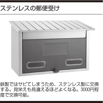 古い物件の場合、郵便受けが古くさくサビていることが大半です。ステンレス製のものに換えることをおすすめします。ホームセンター・カインズホーム(埼玉県をはじめ首都圏中心の展開ですが、愛知県や岡山県にも進出しています)であれば、シンプルなデザインのステンレスのダイヤルロックのものが1個3000円ほどで売っています。
