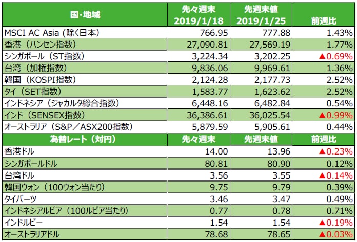 三井住友アセットマネジメント株式会社が、2019年1月21日~1月25日のマーケットについて振り返り、「1. 先週の市場動向、2. 先週のアジア・オセアニア株式・リート市場、3. 先週のマーケット・デイリー/ウィークリー、4. 今週の主な注目材料」のそれぞれについて解説します。今回は、「2. 先週のアジア・オセアニア株式・リート市場」を見ていきましょう。※本連載は、三井住友アセットマネジメント株式会社が提供するマーケットレポートを転載したものです。
