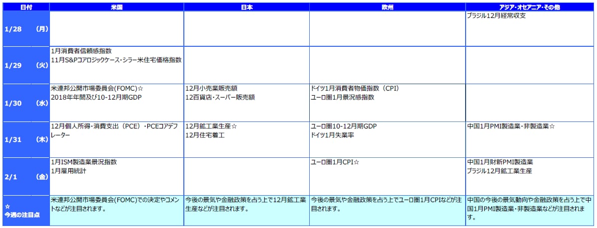 三井住友アセットマネジメント株式会社が、2019年1月21日~1月25日のマーケットについて振り返り、「1. 先週の市場動向、2. 先週のアジア・オセアニア株式・リート市場、3. 先週のマーケット・デイリー/ウィークリー、4. 今週の主な注目材料」のそれぞれについて解説します。今回は、「4. 今週の主な注目材料」を見ていきましょう。※本連載は、三井住友アセットマネジメント株式会社が提供するマーケットレポートを転載したものです。