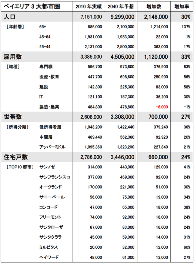 ちなみに、サンフランシスコ・ベイエリアの人口動態実績(2010年)および予測は、「ベイエリア2040」によると、