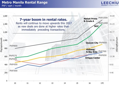 2010年から17年までの推移ですが、マカティは800ペソから1500ペソに、グローバルシティは575ペソから1400ペソへと上がっています。年率での平均上昇率はそれぞれ、9%と13%です。上昇の仕方を見ればわかるように、近年になって完全に経済の中心となってから、上昇率が急になっています。