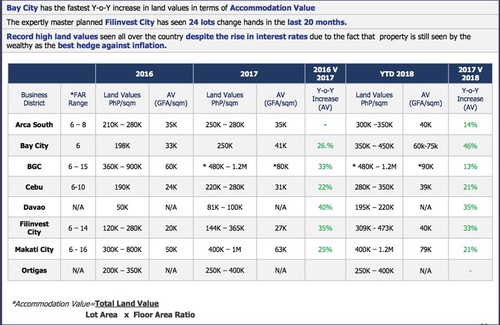 次はマニラ首都圏の、2016年~2018年までの地価の推移です。全体的に堅調に推移していますが、もともと地価が安く、カジノで土地の需要が急増したベイエリアの上昇率が目立ちます。