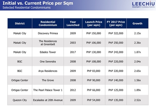 一方、キャピタルゲインの元となる物件価格の上昇はどうでしょうか? マニラ首都圏の代表的な物件について、売り出し(Launch)段階と2017年現在で取引されている市場価格とを比較したのが、次のデータです。