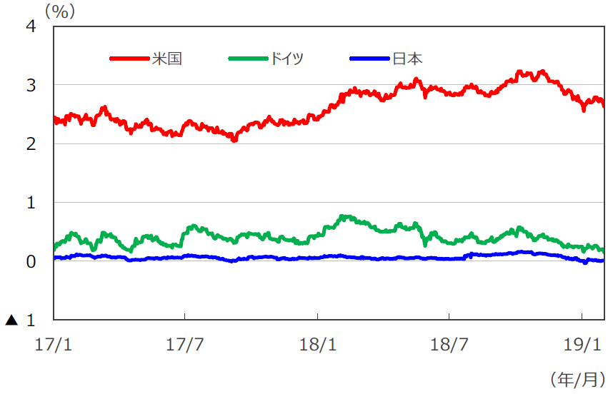 米10年国債利回りは、昨年来の株価調整を受け、年初1月3日に2.55%と約1年振りに2.5%台へ低下しましたが、中旬にかけて米政府が対中関税の引き下げを検討との報道を受け米中貿易摩擦の緩和期待が高まったこと等から2.78%まで上昇しました。下旬は米景気の減速懸念が浮上してきたうえ、FOMCメンバーから利上げに慎重な発言が発せられたこと等を受け、再び低下に転じ、月末は2.63%、前月末比0.05ポイントの小幅低下となりました。欧州では、米中貿易摩擦の緩和や合意なき英国のEU離脱回避への期待等から、ドイツ10年国債利回りが前半に0.28%近傍まで上昇しました。しかし、EUの景気後退懸念が台頭してきたうえ、ECBが域内景気の先行きに対して弱気の姿勢を強めたこと等により低下し、月末は0.15%で引けました。日本の10年国債利回りは、米長期金利の動向を睨みつつ、0.0%近傍での小動きとなりました。米国の社債については、国債との利回り格差が前月末に比べ縮小しました。