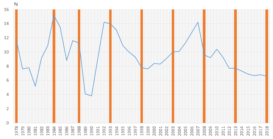 三中全会をはさんで、政治的景気循環が見られてきたことはよく指摘されている(参考:『政治サイクルも景気に影響する中国経済』、2016年2月19日)。党大会や三中全会に向けて実績を示すため、政策的に成長率を押し上げた後、新政権の基盤が安定した三中全会で改革方針を発表・実行し、成長率が鈍化するというパターンで(改革と成長率は二律背反の関係になることが多い)、過去この相関が大きく崩れたのは、90年代後半のアジア金融危機時くらいだった。ただ近年、成長率は下がり続けたままだ。直近の米中貿易戦争という外部要因の他、高齢化、労働力賃金上昇、資本効率の低下など生産要素面の制約から潜在成長率が低下し、またそうした環境変化を踏まえ、過去のような高成長率は追及しない政策スタンスになっている(いわゆる新常態への移行)という内部要因がある。