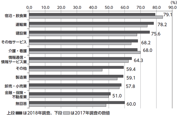 また、日本商工会議所が2018年6月に公表した「人手不足等への対応に関する調査」では、人手不足を感じていると回答した中小企業は65.0%を占め、前年の60.6%から増加しています。
