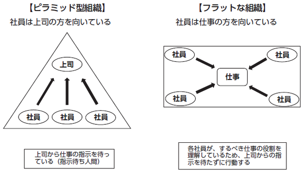 すなわち、社員がセルフマネジメントできる体制をつくるためには、通常の企業に存在するような「上司」→「部下」というピラミッド型の組織を廃して、「“仕事”対“社員”」というように仕事が社員と直接つながっている仕組みを設けることが必要になります。