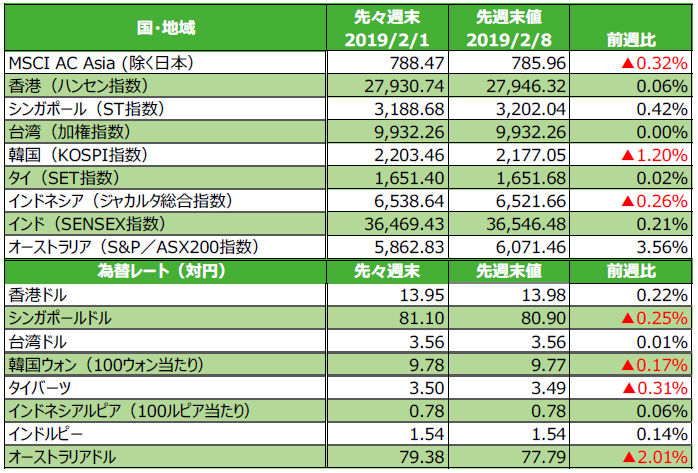 三井住友アセットマネジメント株式会社が、2019年2月4日~2月8日のマーケットについて振り返り、「1. 先週の市場動向、2. 先週のアジア・オセアニア株式・リート市場、3. 先週のマーケット・デイリー/ウィークリー、4. 今週の主な注目材料」のそれぞれについて解説します。今回は、「2. 先週のアジア・オセアニア株式・リート市場」を見ていきましょう。※本連載は、三井住友アセットマネジメント株式会社が提供するマーケットレポートを転載したものです。