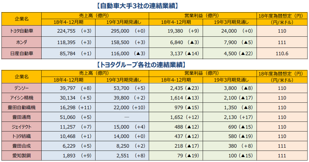 (注3)トヨタ自動車の主要グループ8社は日本経済新聞社の分類による。為替想定は18年度の円/米ドル想定レート。