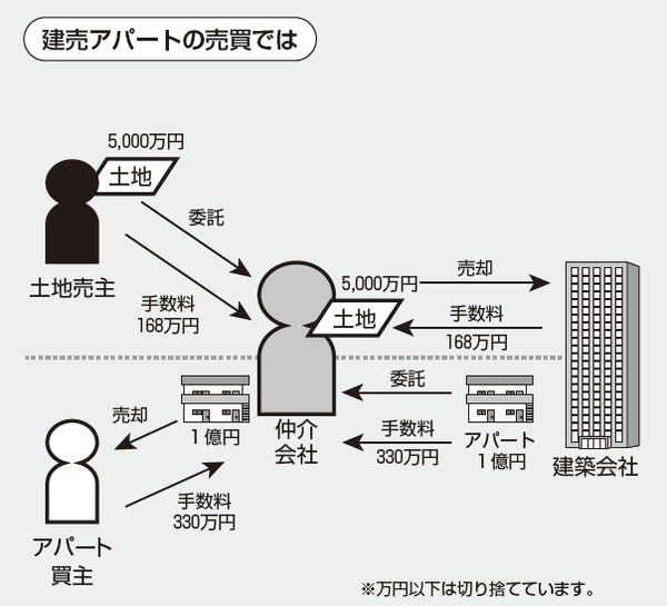 なぜなら、仲介会社の担当者は、土地を紹介して土地分のみの仲介手数料を売主と買主からもらうよりも、一度建築会社にアパート建築用土地として売買を仲介し、売主と建築会社の両方から仲介手数料をもらい、その後建築プランを入れたうえで、新築アパート(土地・建物)の売買を仲介すると、再度それぞれから仲介手数料が入り、1つの土地で二度仲介手数料を稼げる取引になるからです。