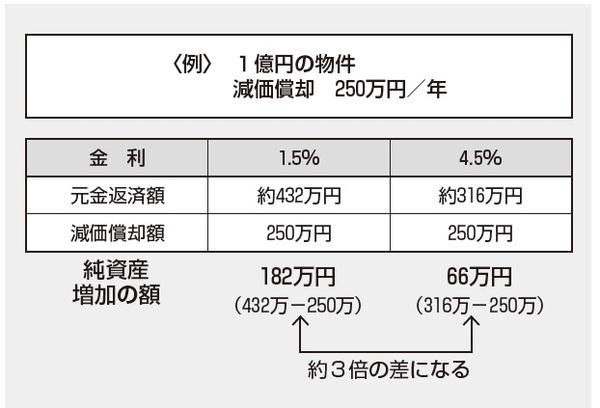以上の理由から高金利の金融機関で借り入れるケースが多くなります。高い金利の融資で賃貸経営しますと、月々の返済においては元金の返済よりも利息分の支払いが多くなる一方で、建物の減価償却が進み、なかなか純資産が増えない状態が続きます。