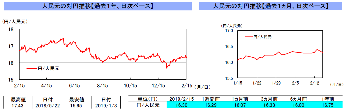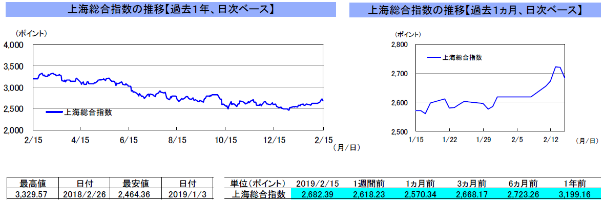 先週の中国本土市場は、上海総合指数が前週末比+2.5%、深セン総合指数が+6.1%と上昇しました。中国商務部により消費促進のための政策推進が発表されたことなどが株価の上昇要因となりました。また、14日から15日にかけて米中通商問題の閣僚級協議が開催されましたが、協議の進展を巡る不透明感から、週後半は様子見姿勢が強まりました。香港市場は、H株指数が前週末比▲0.2%と下落しましたが、レッドチップ指数は+1.9%と上昇しました。週前半は、中国の消費促進のための政策推進への期待や、米中貿易協議の進展期待などから、株価は上昇しました。しかし週後半には、中国の1月の生産者物価指数(PPI)が市場予想を大きく下回ったことが嫌気されたほか、利益確定の売りなどに押され、株価は上値を抑えられました。