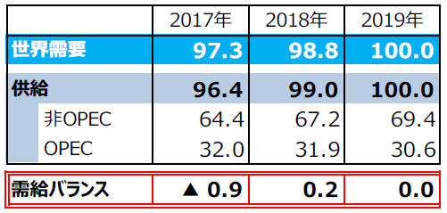 (注3)2017年は実績。2018年はOPECによる推定、2019年はOPECによる予想。ただし、2019年のOPEC生産量は全体の需給が均衡するとの仮定のもとでの弊社算出値。