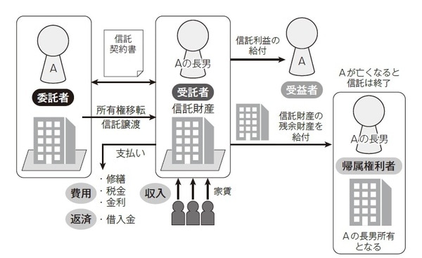本事例の高齢者(A)は、配偶者が病気で入院することとなり、配偶者看病に多くの時間を費やすようになりました。また、Aは高齢に伴い記憶力や計算力が衰えたことにより、Aが所有する不動産の管理に以前より時間がかかるようになりました。Aの長男が定年退職となり、時間に余裕ができたため、Aはこの不動産の管理方法を長男に伝えていきたいと考え、長男を受託者とする民事信託を設定しました。Aの相続時にこの不動産を長男に相続させることをAは考えています。財産管理を長男に任せ、先祖より引き継いできた不動産を長男に承継する信託の仕組みを設計しました。