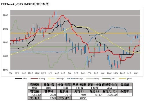 週足一目3本足では、転換線PSEi7819ポイントか、第1フシ目7743Phが下値抵抗ラインとなっており、この水準までの値幅調整を想定しておきたい。