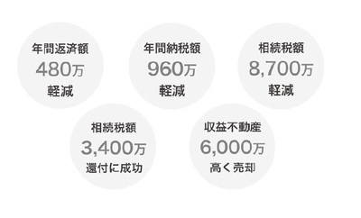 このことにより、年間返済額480万円の軽減、相続税額8700万円軽減、3400万円の相続税還付に成功、など、実に多くの成果を生み出しています。