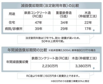 依田氏「木造は鉄骨住宅に比べて空間づくりの自由度が高く、敷地の形状による間取りの制約を受けづらいのも特徴です。オーナーのこだわりが強ければ強いほど、その希望に合わせた建物を具現化することができます。また、木造住宅は減価償却期間(法定耐用年数)が短い点も大きなメリットです。鉄筋コンクリート造の47年、重量鉄骨造の34年に対し、木造住宅(枠組壁工法)は22年。同じ建築費でもより多くの経費(減価償却費)を計上できるため、キャッシュフローの面でも優位性があります」