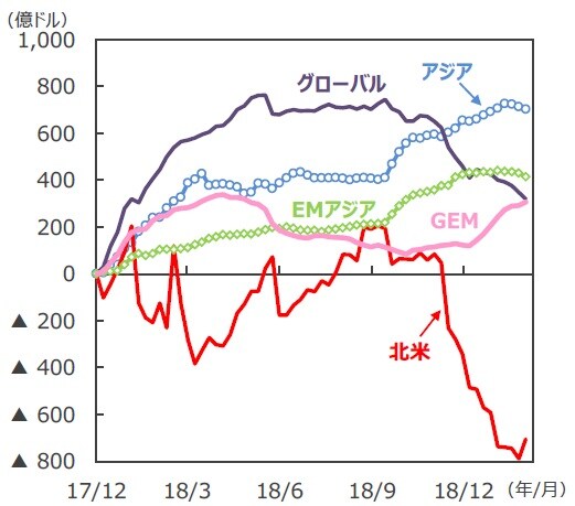 ■内訳を見ると、「北米」が+239億ドル(同+154億ドル)と流入が加速しました。新興国市場全体に投資する「GEM(注3)」への流入も+69億ドル(同+90億ドル)と引き続き流入超が続いています。
