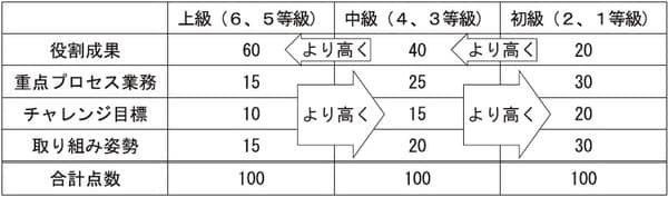 ②上級職になるほど、役割成果に対するウエイトが高くなる。