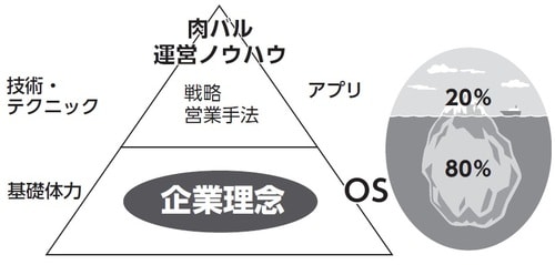 松下幸之助は、成功の50%を占める絶対条件が経営理念の確立、30%を占める必要条件が社風、残りの20%の付帯条件が戦略と戦術だと述べています。つまり、OSが8割、アプリが2割ということです。
