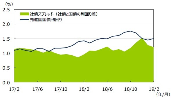 米国では、堅調な株式市場などを背景に10年国債利回りが上昇しました。月中は一進一退の動きとなりましたが、米政府が対中関税の引き上げ延期を表明し、米中貿易交渉の合意が近いとの期待が高まったことなどから、月末にかけて上昇しました。月末は2.72%と、前月末比0.09%ポイントの上昇となりました。欧州では、景気に対する懸念を背景にユーロ圏の成長率見通しが引き下げられたことなどを受けて、2月8日にドイツ10年国債利回りが一時0.077%と、2016年10月以来の水準に低下しました。その後、米国が対中関税引き上げの延長を表明したことや、英国の合意なきEU離脱に対する警戒感が和らぎ、ドイツ10年国債利回りは上昇基調となり、月末には0.18%となりました。日本の10年国債利回りは、米長期金利の動向を睨みつつ、マイナス圏で推移しました。米国の社債については、国債との利回り格差が前月末に比べ縮小しました。