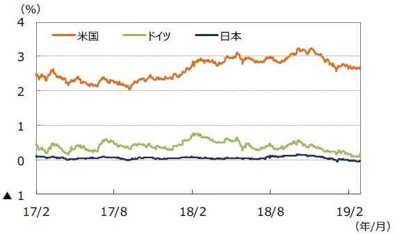 世界景気が緩やかながら拡大を続けるという想定のもとでは、欧米の長期金利はやや上昇すると予想されます。ただし、インフレが落ち着いているなか、FRBが景気下振れリスクの増大を理由に、政策金利引き上げに対する姿勢を更に慎重化させたこと、ECBによる利上げ開始の時期が2019年末以降となる見通しであることなどを踏まえると、上昇幅は限定的と考えられます。日本では、景気・物価の勢いが鈍化するとの想定のもと、現行の金融政策の枠組みが維持される可能性が高く、長期金利は低位での安定した推移となる見込みです。