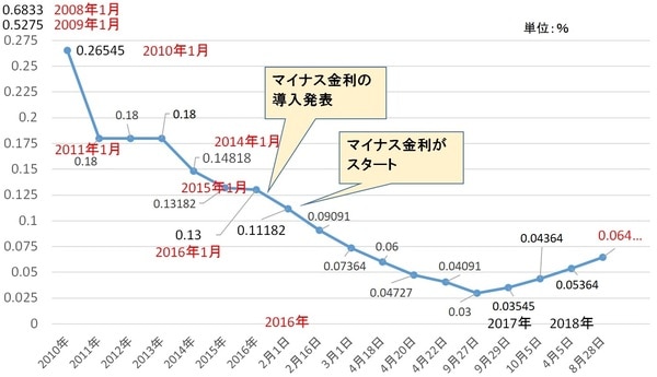 2016年の9月から2017年の9月までの約1年間は、0.03%でまったく動きがありませんでした。2017年の9月下旬以降、数カ月ごとにじわじわ動き始めました。グラフで見ると、右肩上がりの形で上昇しています。