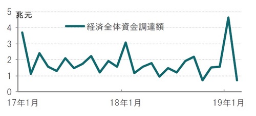 中国の経済指標は1~2月の変動にクセがあるため、1~2月の合計で見ると、資金調達額は18年に比べ今年は増加しており、拡大ペースの維持に疑問はありますが、当面は、景気の下支え要因となる可能性も考えられます。