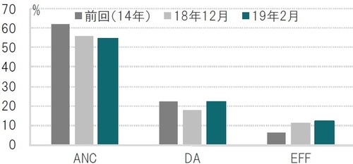 南アフリカ(南ア)のラマポーザ大統領は2019年2月7日の議会施政方針演説で、5月8日に総選挙を実施すると表明しました。アパルトヘイト(人種隔離)撤廃後の1994年に行われた全人種選挙から一貫して政権を維持してきた与党アフリカ民族会議(ANC)への支持はかろうじて過半を維持するも、勢いは低下傾向です(図表1参照)。