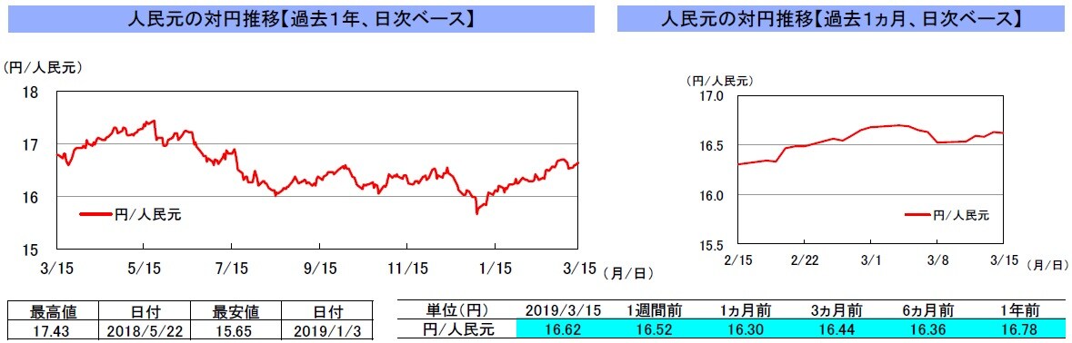 先週の中国本土市場は、上海総合指数が前週末比+1.7%、深セン総合指数は+2.2%上昇しました。前週末に発表された中国の貿易統計を受けて株価が急落していたことの反動もあり、週初から株価は上昇して始まりました。14日に発表された中国の1月~2月の鉱工業生産が市場予想を下回ったことなどが嫌気されましたが、米中通商協議の進展期待や全人代で発表された景気対策への期待などから、株価は上昇しました。香港市場は、H株指数が前週末比+3.1%、レッドチップ指数は+3.2%上昇しました。中国本土市場と同様に、米中通商協議の進展期待や全人代で発表された景気対策への期待などから、株価は上昇しました。