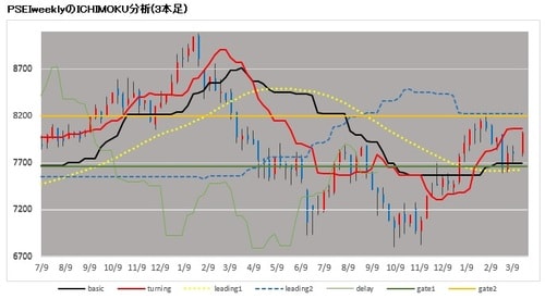 ただ、テクニカル的には、ここから売りの勢力が増す局面で、猪突猛進の買いは避けたい。とくに黄金分割の第2ゲートと上雲が重なる8200ペソラインの攻防は注意が必要だ。