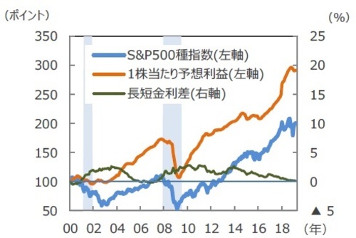 ■米国株式市場は、米中貿易摩擦の長期化などから景気が後退局面入りするのではないかとの懸念を背景に、上値の重い展開となりそうです。景気の先行きを判断するうえで、長短金利差も引き続き意識されると思われます。2000年以降の景気後退局面では先に長短金利が逆転していますが、その後、業績が悪化しています。長短金利差と同時に業績見通しが持ち直すことができるかに注目する必要があります。