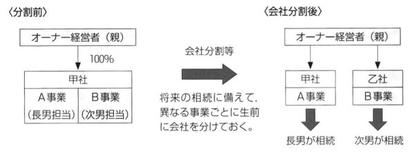 たとえば、A事業とB事業を営む甲社の経営権をめぐって長男と次男が争ったとします。そのような場合、甲社の営む2つの事業の1つであるB事業を会社分割によって新設の乙社に移転するのです。これにより、A事業を営む甲社を長男に承継すると同時に、B事業を営む乙社を次男に承継することが可能になり、会社の経営権をめぐる争いを回避することができます。