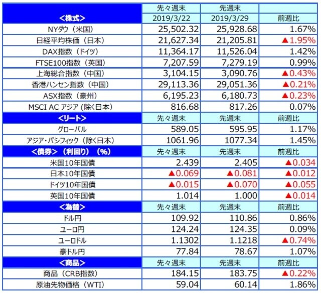 主要国の株式市場はまちまちの動きとなりました。米国株式市場は、長短金利の逆転が続き、世界的景気後退の可能性が懸念されたものの、米政治リスクの後退や、米中通商協議の進展期待、緩和的金融政策の長期化見通しなどを背景に、NYダウは週間では1.67%上昇しました。日本株式市場では、欧州の軟調な経済指標などを受けて欧米で長期金利が低下、米国では長短金利の逆転が続いたことから世界的景気後退が懸念され、日経平均株価は1.95%下落しました。欧州株式市場では、景気悪化への懸念はあるものの米中通商協議の進展期待などからドイツDAX指数は1.42%上昇しました。英国FTSE指数はポンド安などを好感して0.99%%上昇しました。中国株式市場は、上海総合指数、香港ハンセン指数ともに小幅に下落しました。