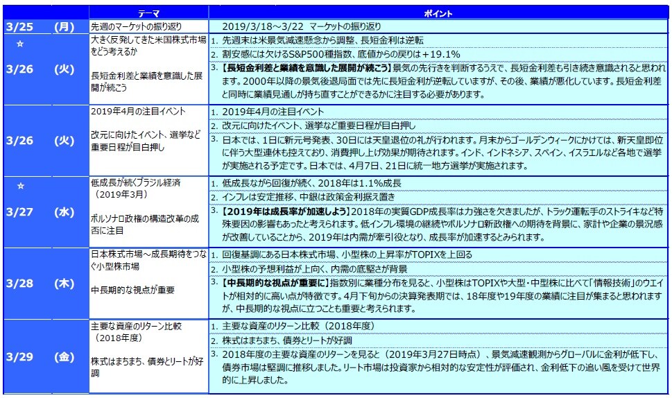 三井住友DSアセットマネジメント株式会社が、2019年3月25日~3月29日のマーケットについて振り返り、「1. 先週の市場動向、2. 先週のアジア・オセアニア株式・リート市場、3. 先週のマーケット・デイリー/ウィークリー、4. 今週の主な注目材料」のそれぞれについて解説します。今回は、「3. 先週のマーケット・デイリー/ウィークリー」を見ていきましょう。※本連載は、三井住友DSアセットマネジメント株式会社が提供するマーケットレポートを転載したものです。