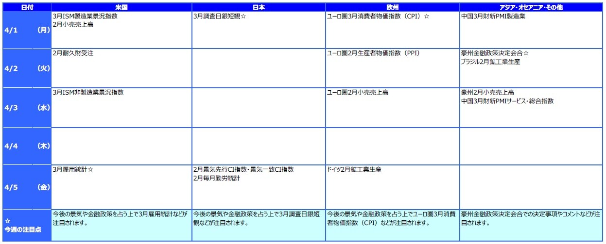 三井住友DSアセットマネジメント株式会社が、2019年3月25日~3月29日のマーケットについて振り返り、「1. 先週の市場動向、2. 先週のアジア・オセアニア株式・リート市場、3. 先週のマーケット・デイリー/ウィークリー、4. 今週の主な注目材料」のそれぞれについて解説します。今回は、「4. 今週の主な注目材料」を見ていきましょう。※本連載は、三井住友DSアセットマネジメント株式会社が提供するマーケットレポートを転載したものです。