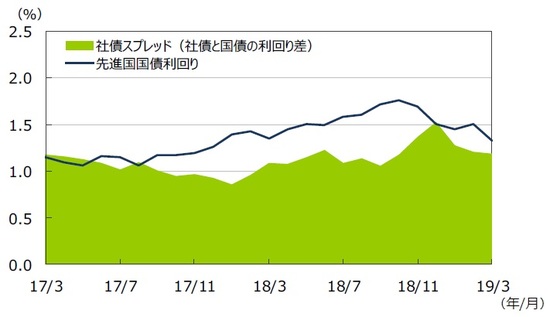 米国では、10年国債利回りが大幅に低下しました。3月のFOMCで、FRBが景気や政策金利の見通しを下方修正したことから、ハト派姿勢を一段と強めたと受け止められました。また、10年国債利回りが3カ月物財務省証券の利回りを約11年半ぶりに下回る「逆イールド」が発生し、先行きの景気後退を示唆するとして警戒感が高まりました。欧州では、ECBが金融緩和方向への早期転換を行ったことや、ドイツの3月製造業購買担当者景気指数(PMI)悪化などを受けて、3月22日にドイツ10年国債利回りが2016年10月以来となるマイナス水準に低下しました。その後、月末にかけて下げ幅を広げました。日本の10年国債利回りは、上旬にはプラス圏に上昇する場面もあったものの、米長期金利の動向を睨みつつ、月間を通じて概ねマイナス圏で推移しました。米国の社債については、国債との利回り格差が前月末に比べ縮小しました。